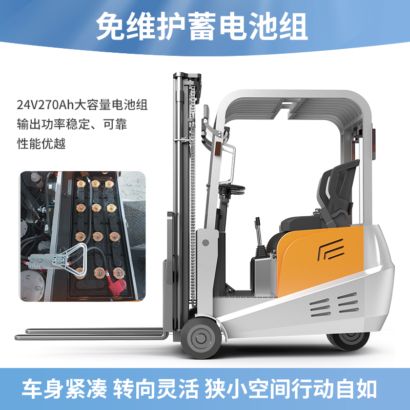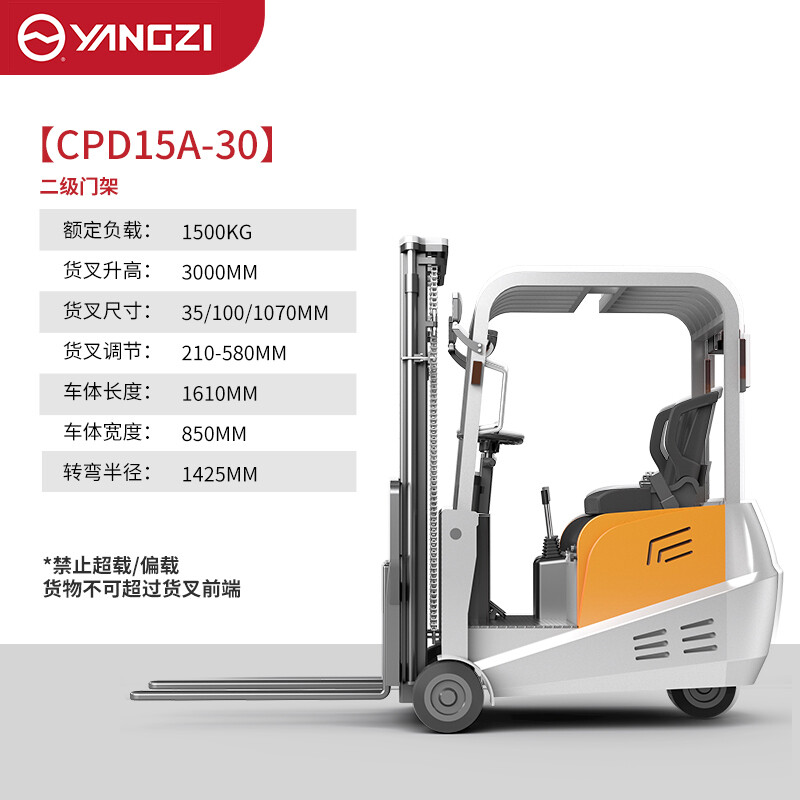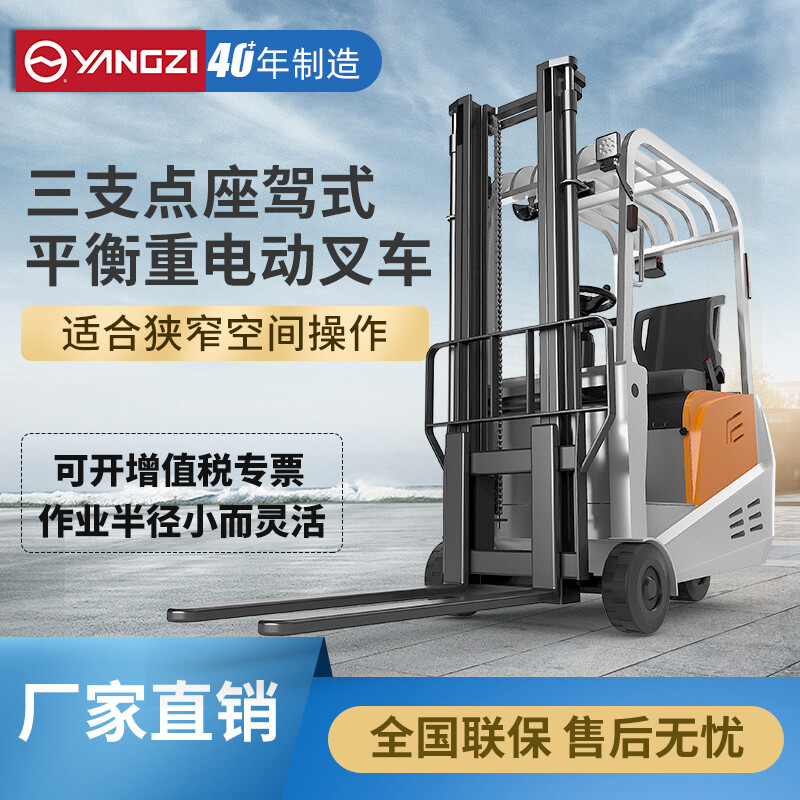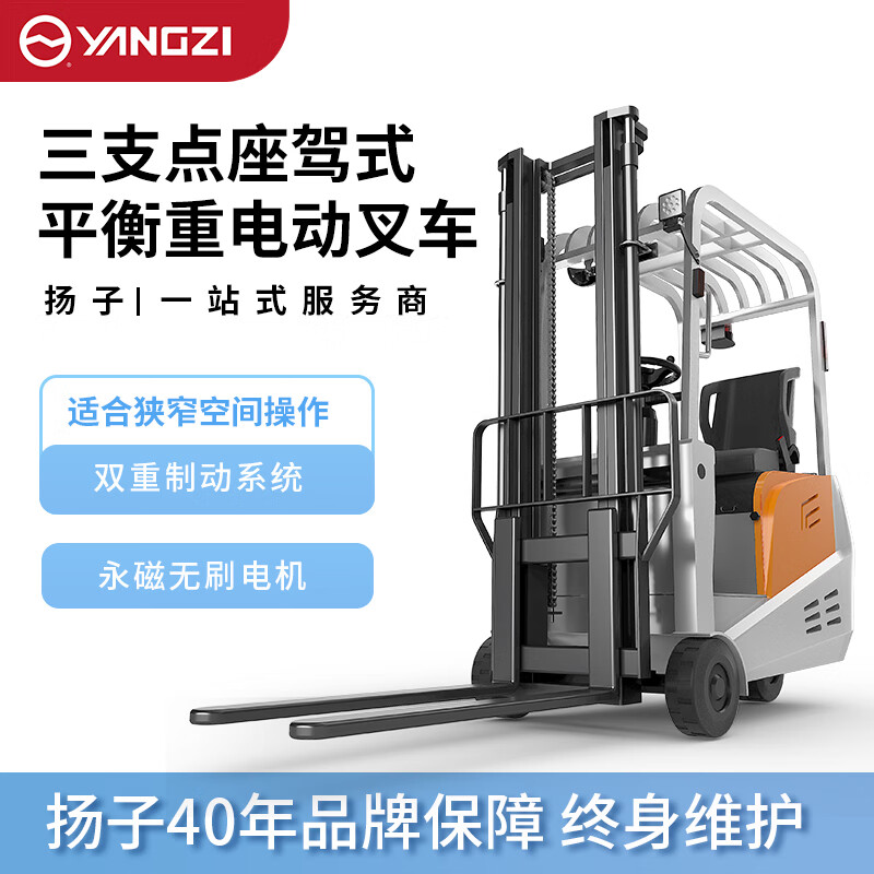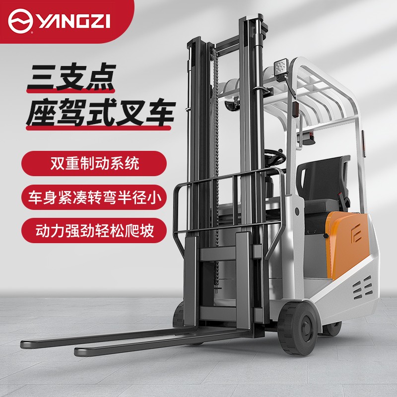 揚(yáng)子三支點座駕式平衡重電動叉車CPD-A,動力強(qiáng)能耗低免維護(hù)低噪音,車身小巧/全車LED警示燈/制動雙保險